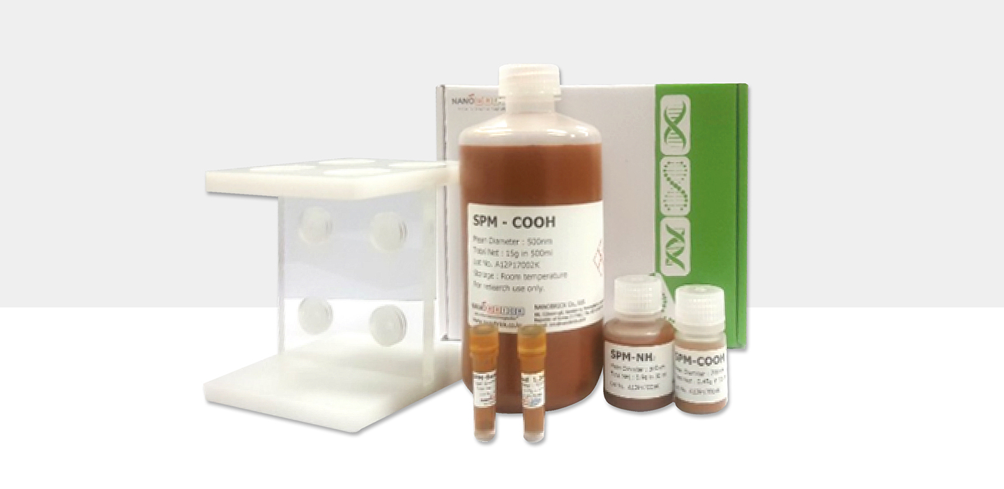 M-Bead is specifically developed to separate and purify specific substances such as protein, DNA, nitric acid, cesium, etc. quickly and simply by the magnetic field using coated high functional group on uniformed nanoparticles.