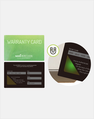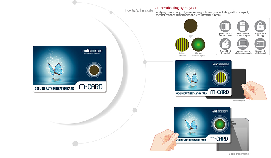 M-Card is a plastic card based genuine authentication solution that is less likely to be duplicated by applying MTX material (magnetically color changeable photonic crystal). It is applicable to various prepaid cards to prevent financial forgery, to ID card to verify personal identification and to secure product plate, etc. to effectively enhance credibility.