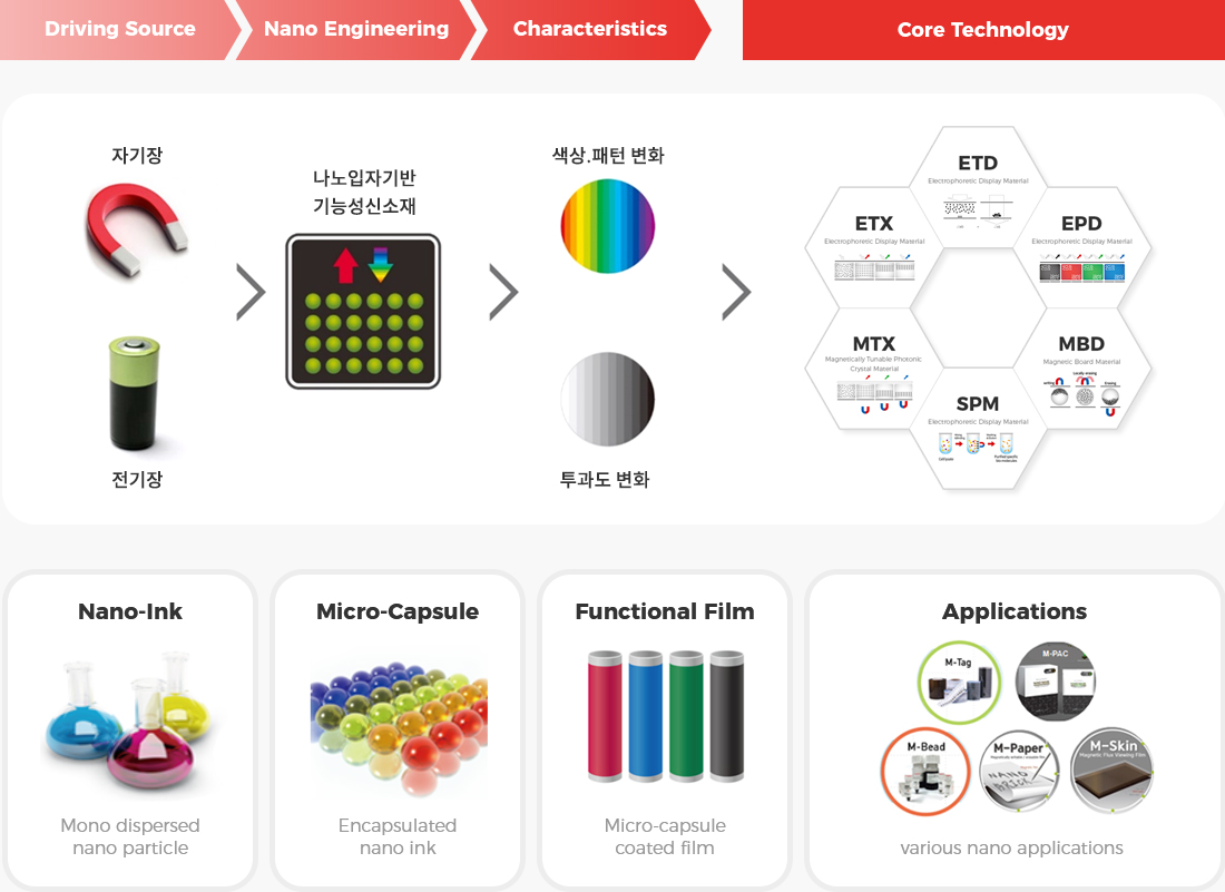 상용화 제품에 적용된 우수한 핵심 기술은 제품 파이프라인을 다변화시키는 밑거름이 되었고 궁극적으로 나노신소재의 특화된 장점이 최첨단 보안 기술이 요구되는 금융시장솔루션의 개발로 이어지며 제품 영역을 확장해가고 있습니다. 나노실리칸첨단소재는 혁신적인 신소재 제품군과 함께 정품인증솔루션(M-TAG), 정품인증패키징솔루션(M-PAC), 자성문구보드(M-PAPER), 자성표장제(M-SKIN) 등 무한한 확장성을 내포한 응용 제품을 개발하여 체계적인 제품 포트폴리오를 갖추게 되었습니다.
