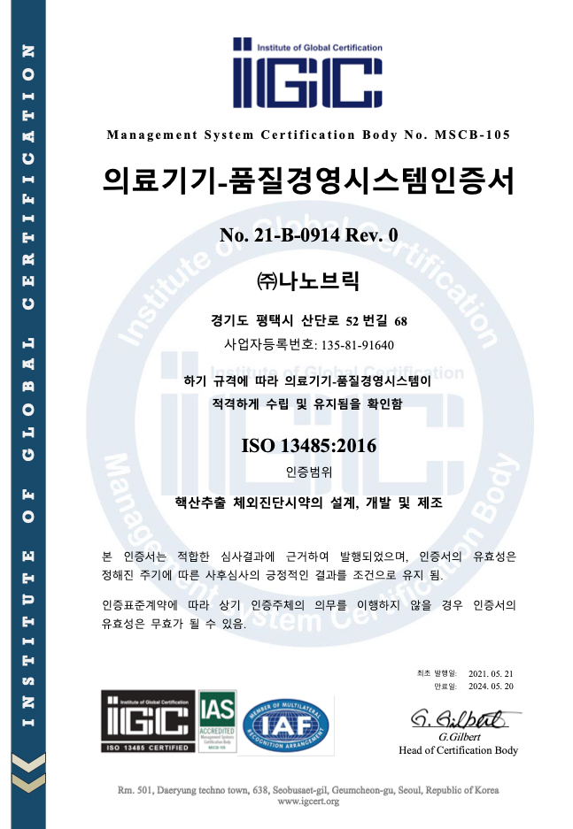 [인증서] 국제 표준 의료기기 품질경영시스템 ISO13485