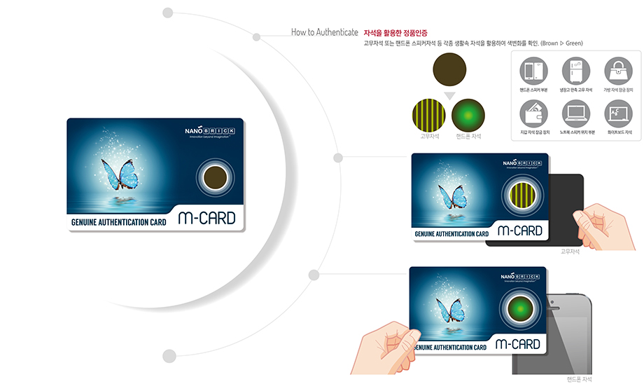 M-Card는 자체 개발된 자기색가변나노소재가 적용되어 복제가 사실상 불가능한 카드형태의 정품인증솔루션입니다. 다양한 선불카드에 적용하여 금융사기 등의 피해를 방지할 수 있고, 신분을 확인할 수 있는 개인ID카드, 고가의 기계장치의 제품명판 등 신뢰성 확보 솔루션으로 응용이 가능한 보안카드 제품입니다