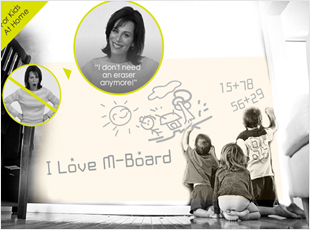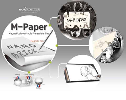 M-Paper는 자성 나노 입자를 이용해 자석펜으로 쉽게 쓰고 지울 수 있는 필름 형태의 보드제품으로, 기존 화이트보드나 블랙보드 제품에 비해 분진이나 유해물질 등이 전혀 발생하지 않는 친환경 제품입니다. M-Paper는 청결을 요하는 사무실이나 클린품 등에 유용하게 사용될 수 있으며, 특히 일정 시간이 지나면 스스로 지워지는 기능이 탑재되어 자동으로 낙서가 지워지는 유아용 벽지나 문구류 등에 효과적으로 적용할 수 있는 제품입니다.